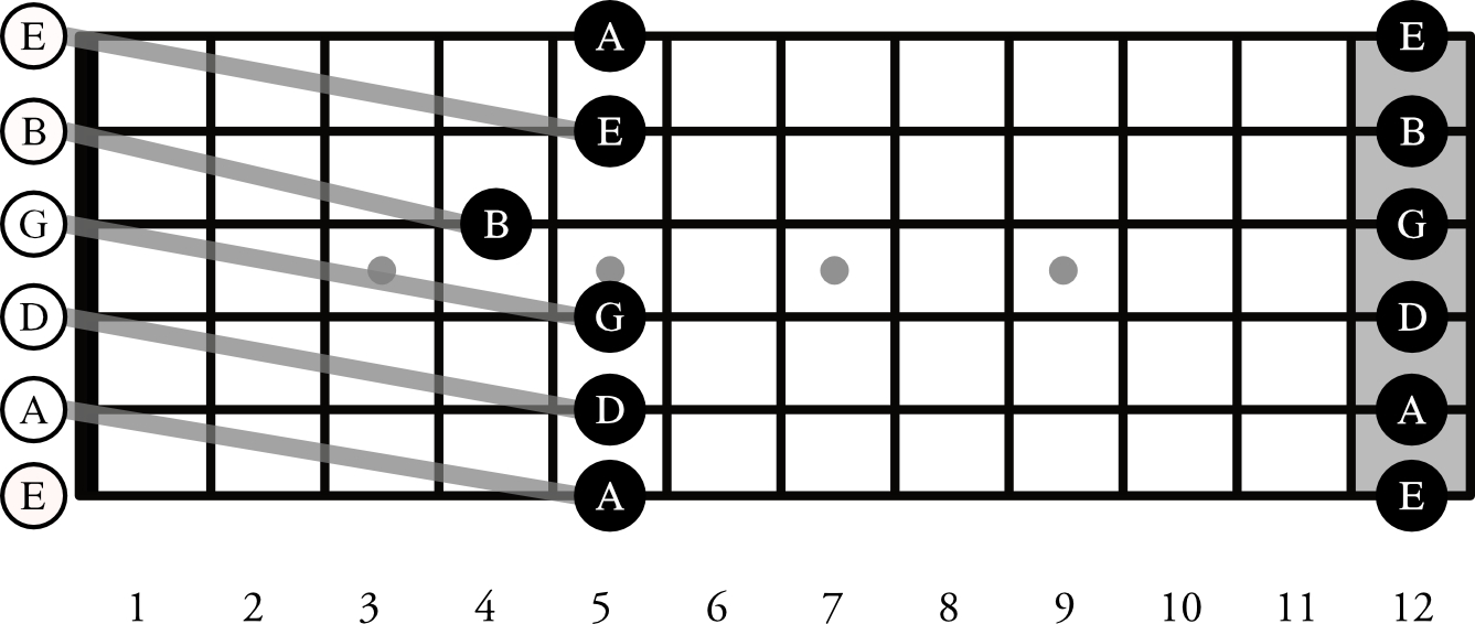 This method of locating notes gets easier if we add another guidepost. Most guitarists learn to tune the instrument using the notes at the 5th fret, and the 4th fret on the G string, as reference pitches.