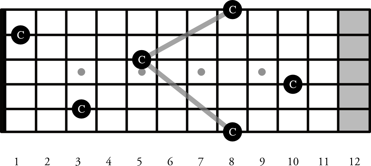 The following diagrams offer three different shapes for visualizing octaves all over the fretboard. For demonstration purposes we will only look at C notes on the fretboard.