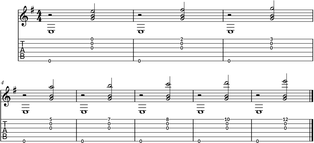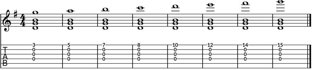 A good way to start thinking about tension and release is to play a scale over a single chord. One way to practice this is to take advantage of the G major triad formed by the open D, G, and B strings.